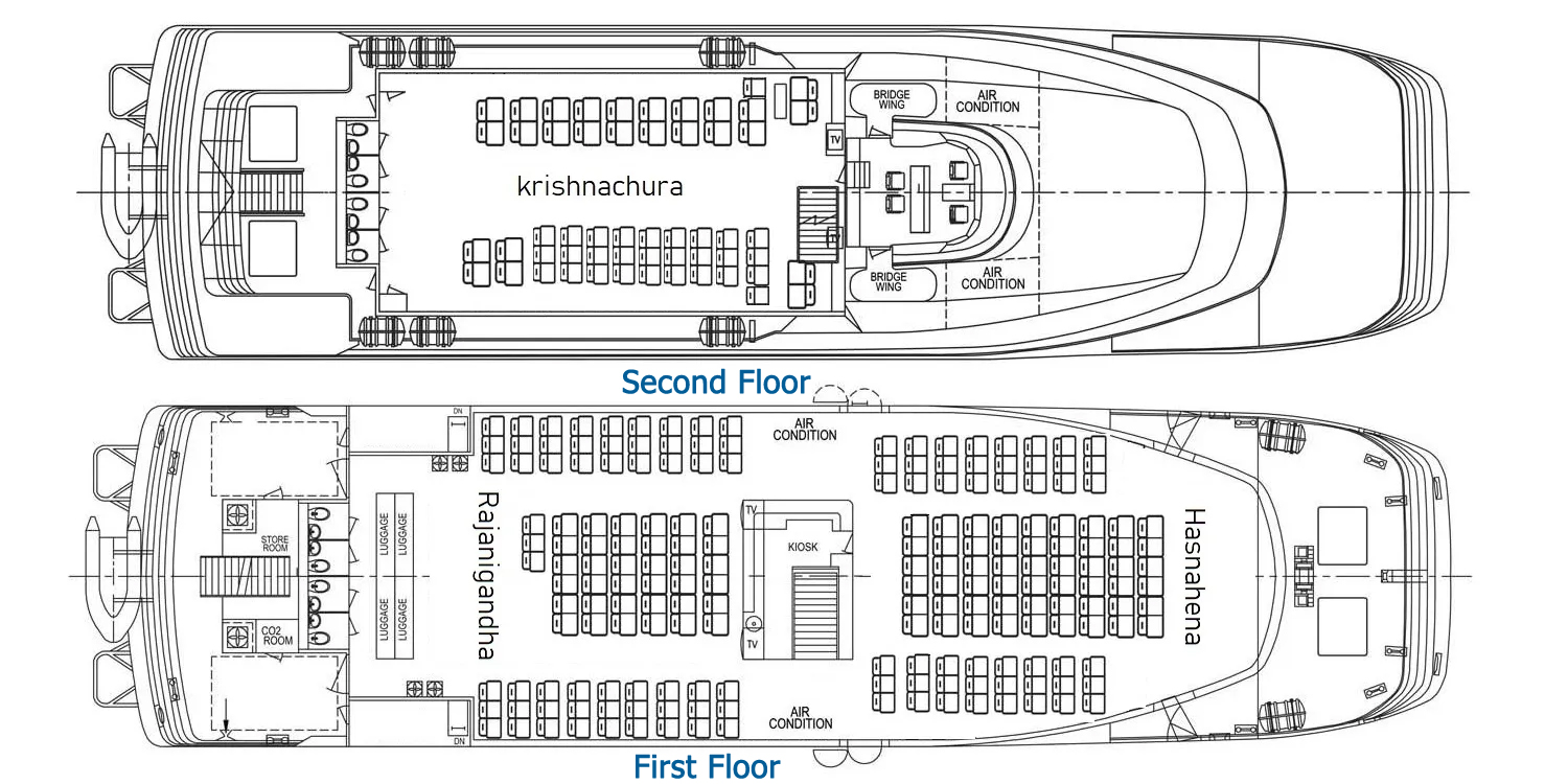 কক্সবাজার শহরের নুনিয়াছড়া (এয়ারপোর্টের পাশে) ঘাট থেকে নির্দিষ্ট নিন্মের শিডিউল অনুযায়ী চলাচল করছে।*Note: Due to tide or unavoidable circumstances, timings might change. আমাদের বে ক্রুজ জাহাজ এর বৈশিষ্ট্য সমূহঃ |